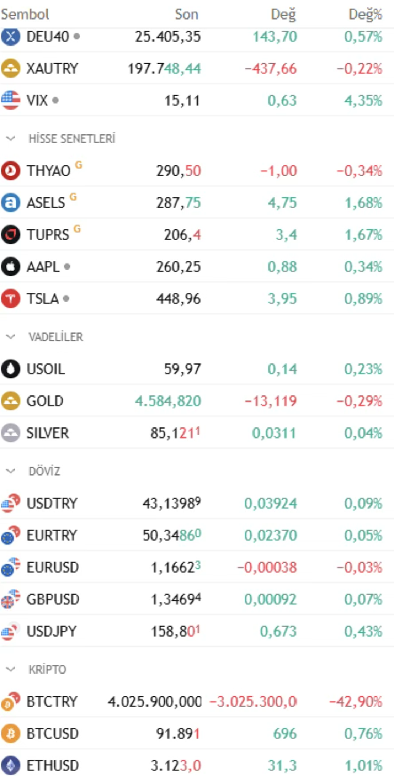 • ABD 10 yıllık tahvil faizi: %4,18, Dolar Endeksi: 98,9, Ons altın: 4.598 USD